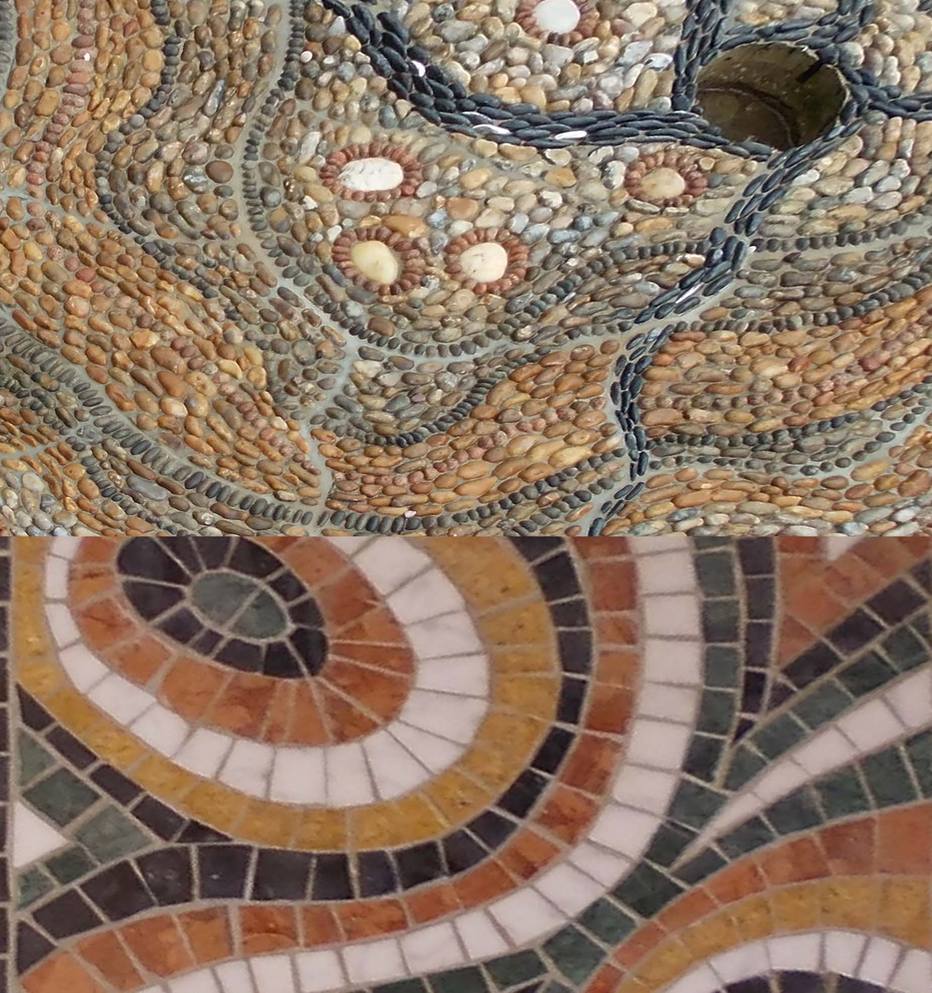 From the original eight under consideration, we have shortlisted two. These designers are both very talented, and we believe either could give an excellent interpretation, but they offer contrasting approaches – one works in pebble mosaic, the other in the traditional tesserae. The picture shows small samples of their work.